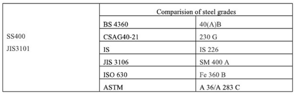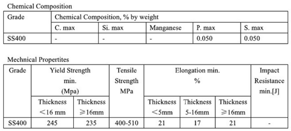 再看看SS400的化學(xué)成分和力學(xué)性能,化學(xué)成分上顯示此鋼無金屬合金元素,屬于碳素結(jié)構(gòu)鋼,力學(xué)性能和Q235系列基本吻合;